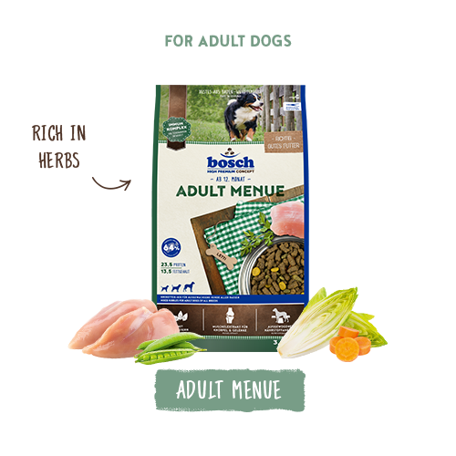 Bosch Adult Menue er vandlega samsett heilfóður sem sameinar mismunandi prótín- og grænmetisfóðurbita sem innihalda blöndu af 12 hágæða jurtum. Fóðrið hefur vel stillt hlutfall prótíns (23,5%) og fitu (13,5%), sem tryggir góða næringu bæði fyrir fullorðna hunda í meðalhreyfingu og líka þá sem eru virkari.