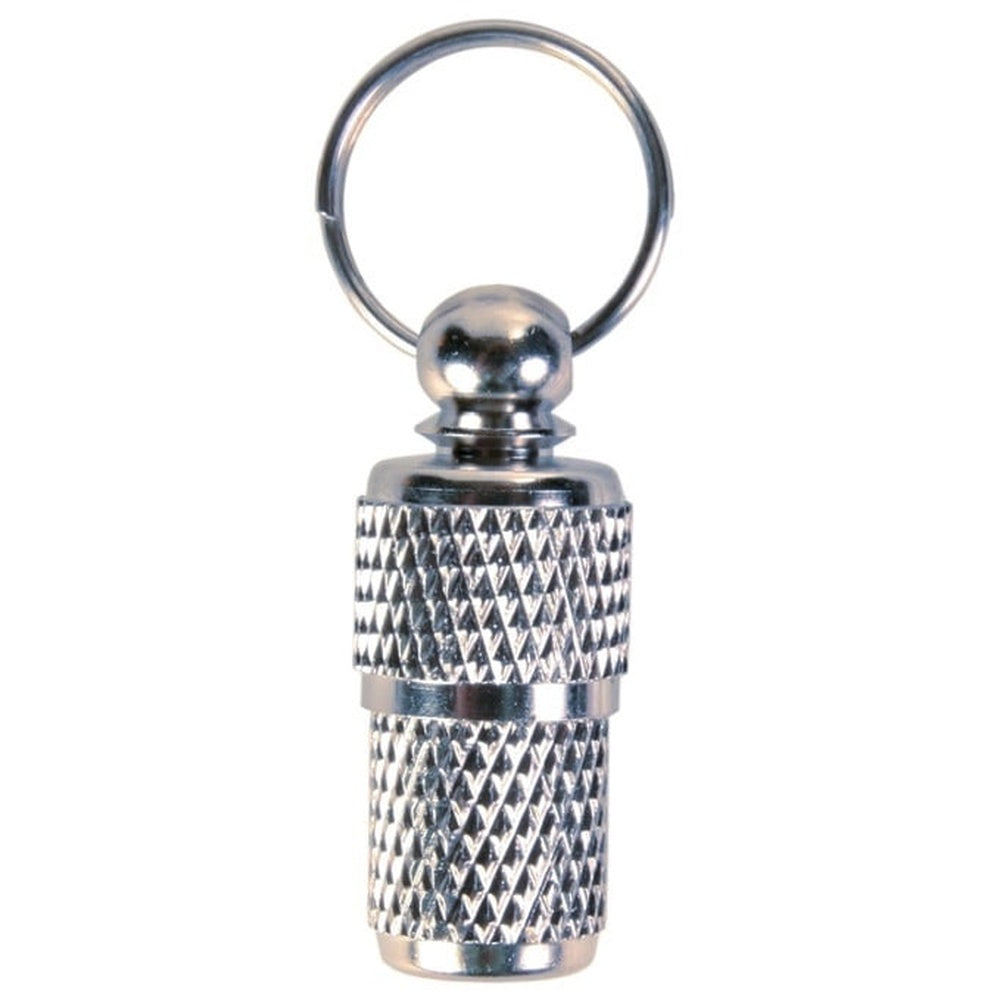 Lítil merkitunna úr málmi. Hentar fyrir hunda jafnt sem ketti. Miði með heimilisfangi dýrsins er settur ofan í tunnuna.