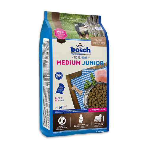 Bosch Medium Junior hentar sérstaklega vel fyrir meðalstóra hvolpa sem verða 15–25 kg fullvaxta. Fóðrið styður jafnvægi í vexti án þess að stuðla að of hröðum vexti. Bitastærð og lögun hafa verið sérsniðin að þörfum meðalstórra hunda.
