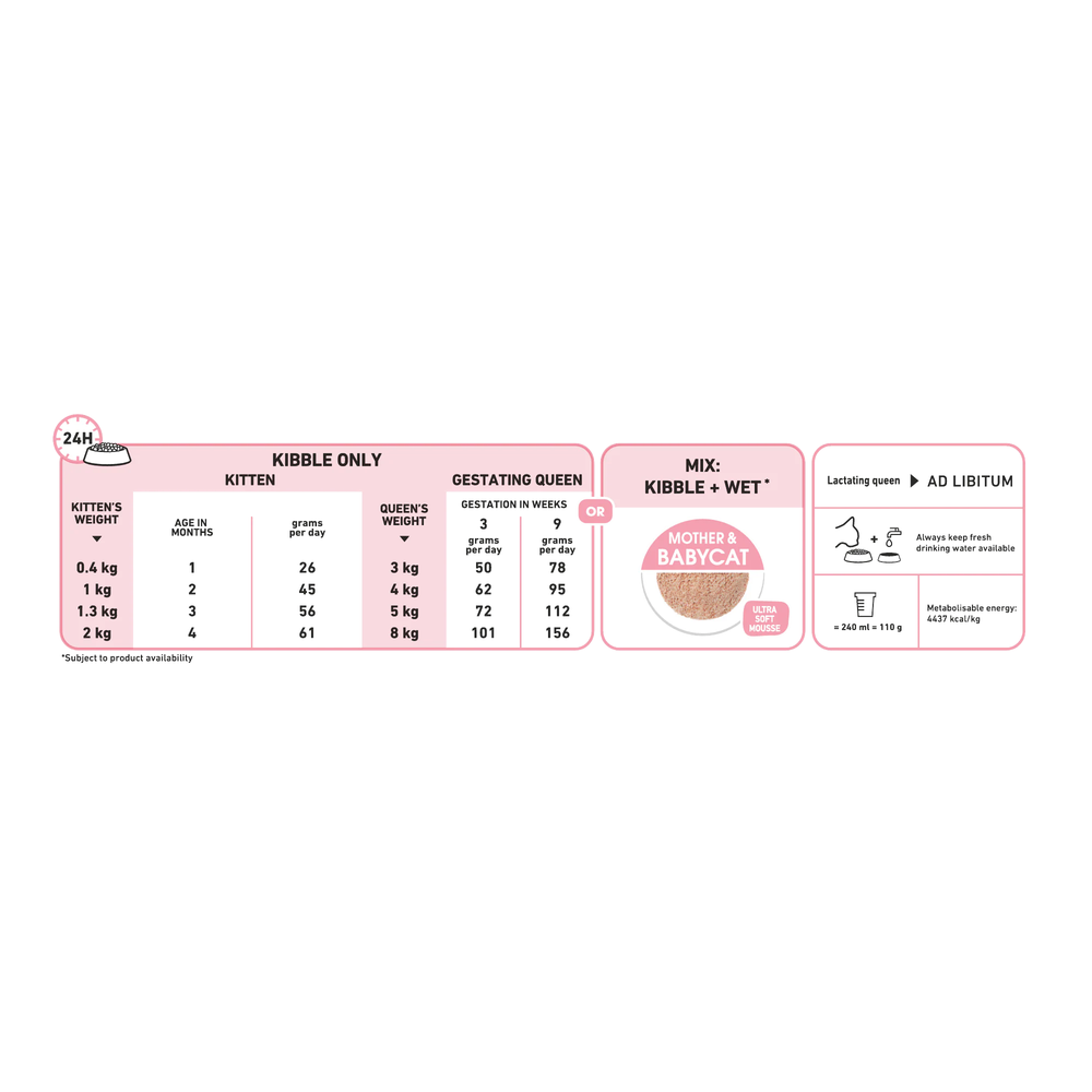 Kettlingafóður frá Royal Canin fyrir kettlinga frá 1-4 mánaða og kettlingafullar og mjólkandi læður. Sérsniðið að vöxt og þroska kettlinga í örum vexti. Inniheldur C- og E-vítamín til að styðja við sterkt ónæmiskerfi. Með DHA fitusýrum sem eru mikilvægar fyrir þroska heilans og góða sjón.